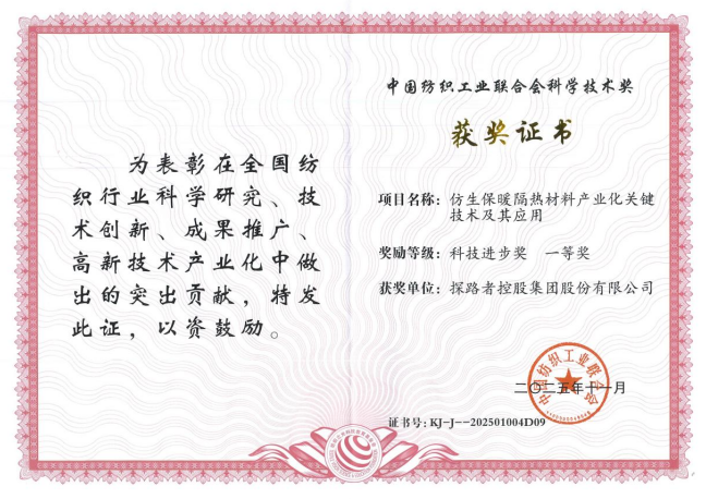 在这场中国纺织行业的顶级科技嘉会上,共评比出当然科学奖、技能发明奖和科技超越奖52项(其中一等奖14项,二等奖38项),桑麻学者奖4东谈主。由探路者集团与东华大学等单元连合完成的《仿生御寒隔热材料产业化环节技能过火运用》情景,荣获科技超越奖一等奖!